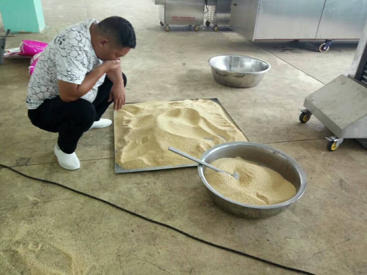 湖北做芝麻糖老板來廠考察電磁炒貨機(jī),炒脫皮芝麻試機(jī)中